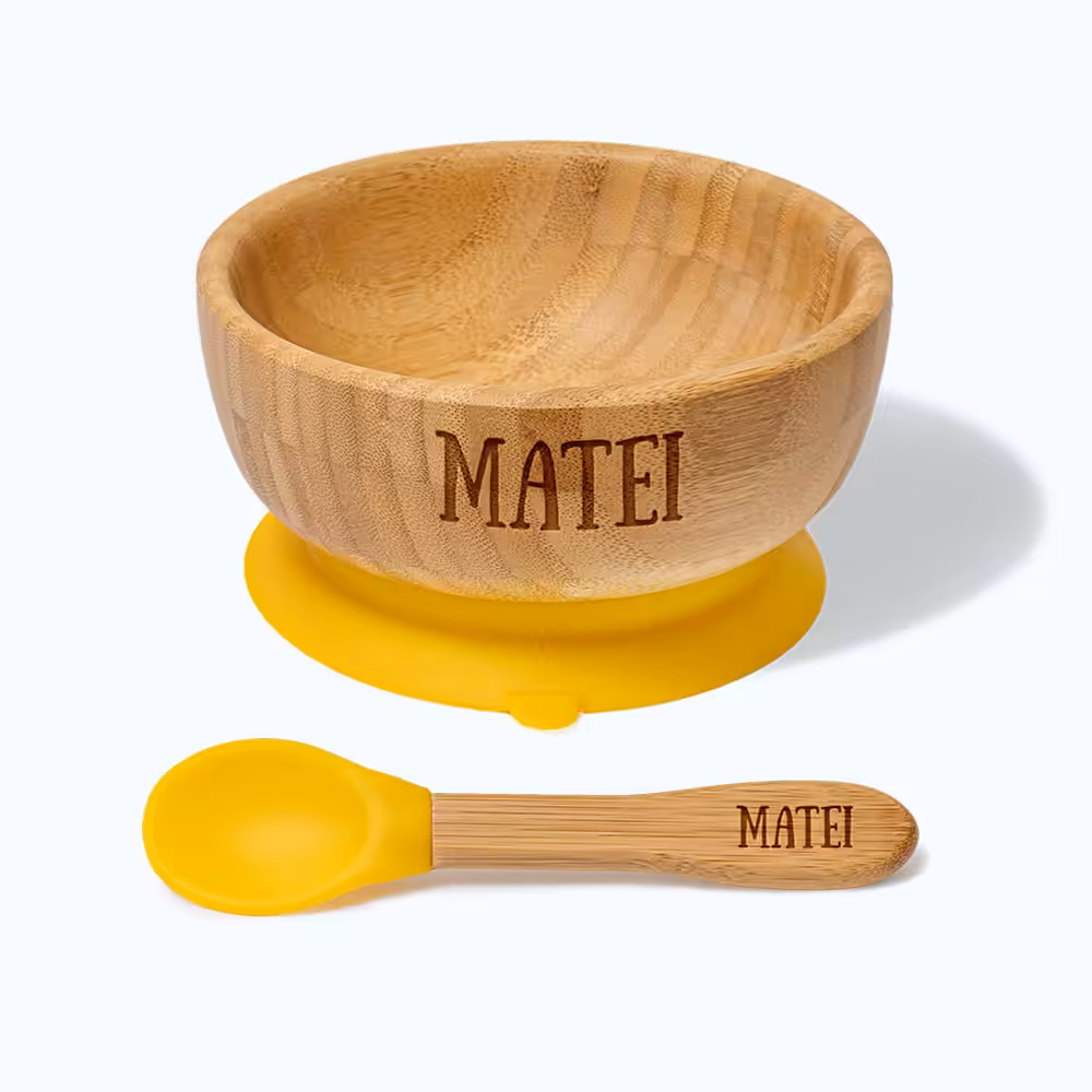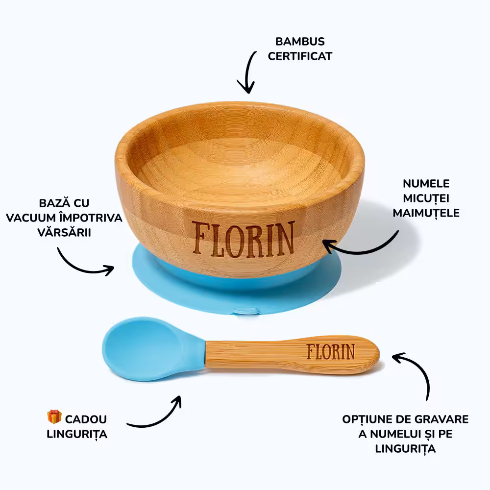 - Vas din bambus – 14 cm diametru; 6 cm adâncime. În funcție de densitatea piureurilor pregătite pentru bebeluș, încape aproximativ 300-350 gr. mâncare/350ml.