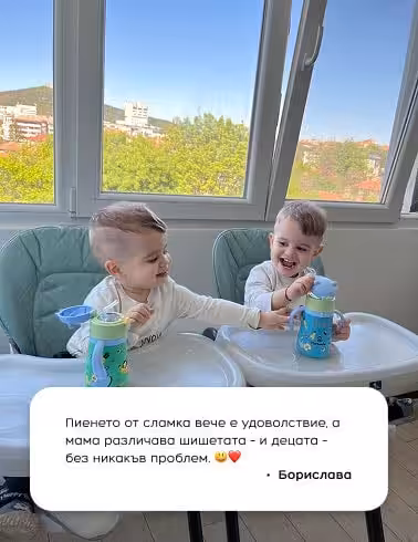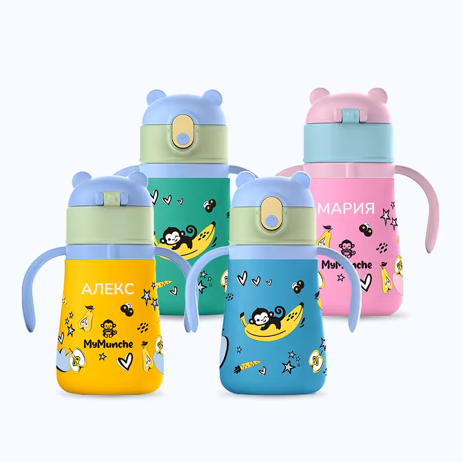 Бутилка с вместимост 360 мл, капак със сламка, дръжки от двете страни, готова с гравирано име на детето.